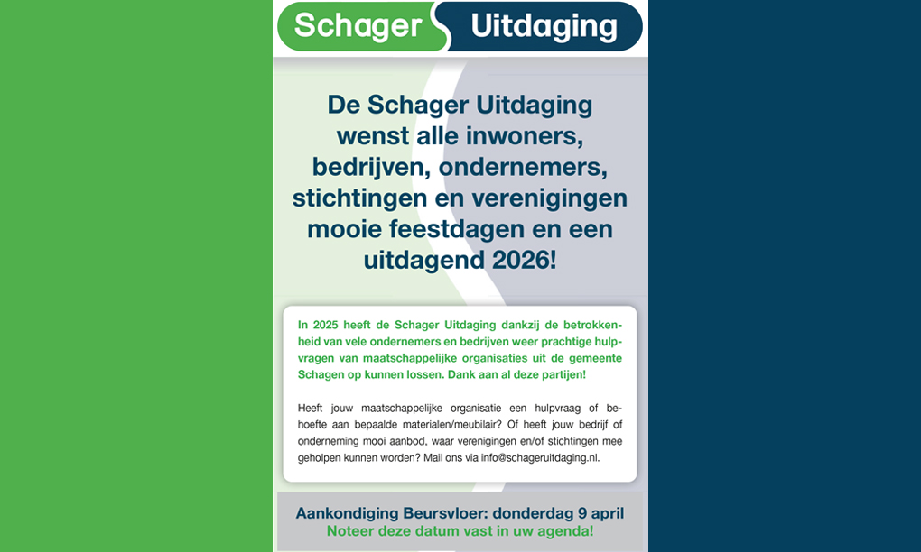 De Schager Uitdaging wenst alle inwoners, bedrijven, ondernemers, stichtingen en verenigingen mooie feestdagen en een uitdagend 2026! In 2025 heeft de Schager Uitdaging dankzij de betrokkenheid van vele ondernemers en bedrijven weer prachtige hulpvragen van maatschappelijke organisaties uit de gemeente Schagen op kunnen lossen. Dank aan al deze partijen!